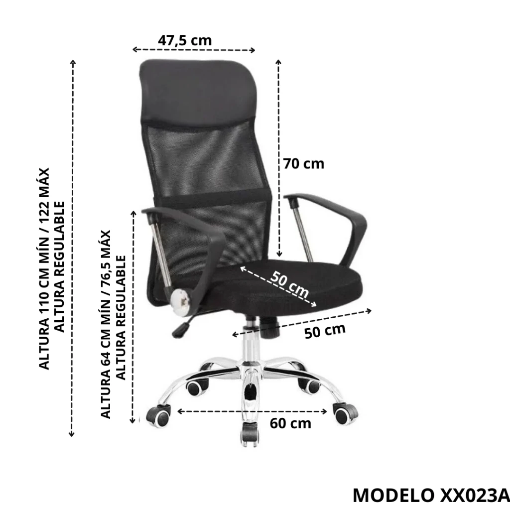 La silla de escritorio XX023A de color negro con tapizado de mesh RMA es una opción elegante y funcional para tu espacio de trabajo. Con un respaldo de 70 cm de altura y un ancho de 47.5 mm, brinda comodidad y soporte durante largas jornadas laborales. Su base de 62 cm de diámetro y estructura cromada le dan estabilidad y durabilidad. Además, su mecanismo basculante y respaldo reclinable te permiten ajustarla a tus preferencias para una mayor comodidad. Con una altura máxima de 122 cm y un peso máximo soportado de 120 kg, es ideal para diferentes tipos de usuarios. ¡Aprovecha esta oportunidad para mejorar tu experiencia en el trabajo con la silla de escritorio XX023A!